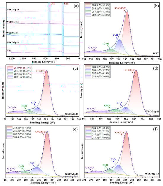 (a) XPS; (b) C1s of WSC; (c) C1s of WSC/Mg-21; (d) C1s of WSC/Mg-11; (e) C1s of WSC/Mg-12; (f) C1s of WSC/Mg-13.