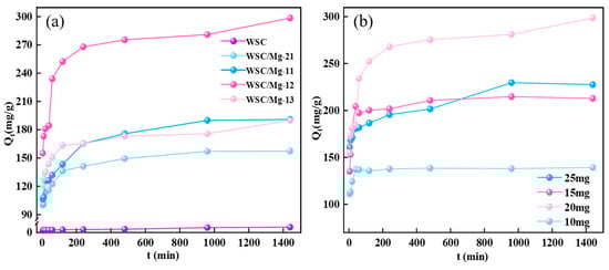 In the adsorption experiment, the utilization of adsorbent quantity is also a critical factor for evaluating the adsorption performance. Consequently, subsequent experiments were conducted to further investigate based on the optimal WSC/Mg-12. As depicted in Figure 5b, an increase in 2,4-DCP adsorption by the adsorbent was observed as the amount of added adsorbent increased from 10 mg to 25 mg. Notably, at an addition of 20 mg, the adsorption system exhibited its highest capacity at 295 mg/g; however, this capacity remained unchanged when the addition was raised to 25 mg. Therefore, it was determined that the optimal amount of added adsorbent should be 20 mg. When there are more novel chlorine-based disinfection by-products in solution than active sites on the surface of the adsorbent, there will be a decrease in adsorption capacity below this threshold point. Conversely, exceeding a dose of 25 mg will lead to excessive active sites and result in wasted capacity and reduced equilibrium absorption.