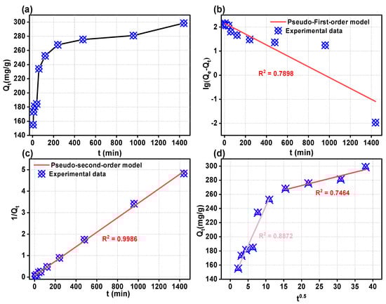 (a) The relationship between the duration of adsorption and the amount of adsorption; (b) pseudo-first order model; (c) pseudo-second order model; (d) intra-particle diffusion model of WSC/Mg-12.