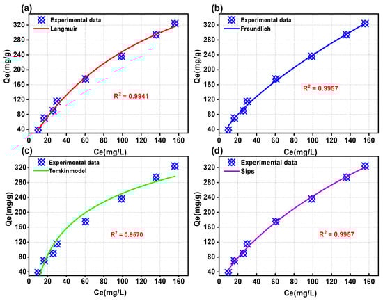To understand the feasibility, performance, capacity, and mechanism of an adsorption system, it is necessary to fit adsorption isotherms [49,50]. To achieve this, we conducted adsorption fitting experiments using four different models: Langmuir, Freundlich, Temkin, and Sips [51,52]. These experiments were conducted for a concentration range of 50 mg/L–400 mg/L of 2,4-DCP.