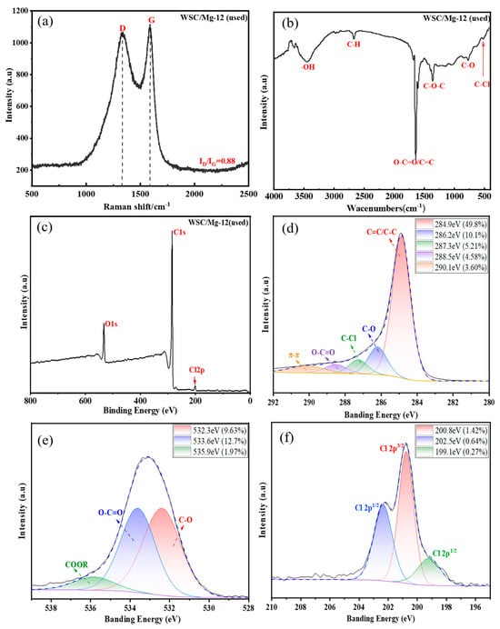 (a) Raman spectra, (b) FT-IR spectra, and (c) XPS of WSC-12 (used); (d) C1s, (e) O1s, and (f) Cl2p of WSC-12 (used).