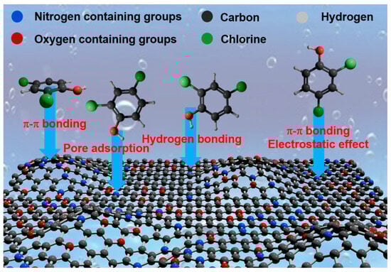 Since the global outbreak of the novel coronavirus, daily disinfection and sterilization have become standard practice. Chloride ions are widely employed as the preferred option for this purpose [1,2,3]. However, chloride ions readily react with organic matter, pollutants, and other ions to generate disinfection by-products (DBPs) [4,5,6]. Numerous studies have reported on the toxicity, carcinogenicity, and mutagenicity associated with most DBPs [7]. Over 800 species of DBPs have been identified in the water system. Among them, a new cyclic chlorine disinfection by-product, chlorophenol DBP, stands out due to its stable C−Cl bond and aromatic benzene ring structure; it has been classified as a priority pollutant by several countries, including China [8,9]. Technologies based on biology [10,11], chemistry [12,13,14] and physics [15,16] are utilized for treating chlorophenol DBPs in water. Among these technologies, adsorption technology is considered the optimal choice due to its operational simplicity and cost-effectiveness [17]. Hierarchical porous carbon, which is economical and environmentally friendly, is widely recognized as a highly promising adsorbent material [18].