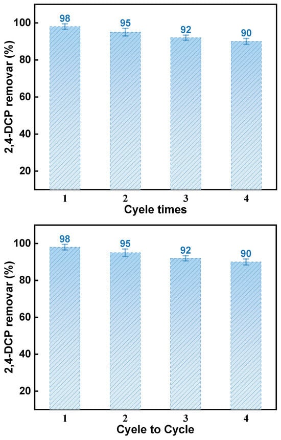 The recyclability of materials is a crucial factor in determining their reusability and economic viability. Following adsorption experiments, desorption and regeneration studies were conducted to assess the material’s recyclability and stability for practical applications, as shown in Figure 12. After adsorbing 2,4-DCP, waste samples were collected and dried at 60 °C for 4 h. The spent sample was then calcined at 450 °C to decompose 2,4-DCP [57]. The figure shows a decrease in the adsorption capacity of the material for 2,4-DCP with each recovery test. This decrease suggests that some of the adsorption sites are occupied by residual 2,4-DCP molecules, and the adsorbent becomes inhomogeneous after each experimental operation. However, after four recycle runs, the sorbent’s adsorption capacity remained above 90% of the original value, demonstrating the material’s good recoverability.