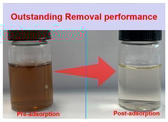 The water sample of coking wastewater before and after adsorption is depicted in Figure 13. It can be observed from the figure that substantial alterations occurred in the water sample, with the post-adsorption sample exhibiting near-clarity. This observation signifies the successful synthesis of multi-functional layered porous carbon, wherein the WSC/Mg material not only demonstrates stability, efficiency, and anti-interference properties but also possesses a higher capacity for adsorbing target pollutants. Moreover, its adsorption characteristics towards coking wastewater are notably superior.