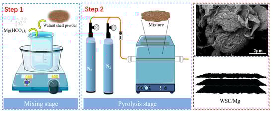 The walnut shells (WSs) were thoroughly rinsed with distilled water, air dried naturally, pulverized using a flour beater, and subsequently sieved to obtain 200-mesh walnut shell powder for subsequent utilization. A total of 1 g of walnut shell powder was taken and placed in a 50 mL beaker. Then, 10 mL of deionized water and different quantities of magnesium bicarbonate were added. The components were thoroughly mixed and the mixture was heated in an 80 °C water bath until it formed a paste. The mixture was allowed to dry overnight at 100 °C before being transferred to a 50 mL quartz boat. It underwent calcination under an N2 atmosphere at 700 °C for 2 h (heating rate of 3 °C/min), followed by cooling to room temperature before being retrieved as a black product. To eliminate any unreacted magnesium bicarbonate, the material was immersed in a solution of HCl with a concentration of 2 mol/L (S/V = 1/20). The stirring process was continued for a duration of two hours, followed by multiple rinses with deionized water until the material achieved a neutral pH. Then, it was dried overnight at 60 °C, ground into a powder, and stored at room temperature for future use. The materials were named according to the different mass ratios of walnut shell powder to magnesium bicarbonate; for example, WSC/Mg-21 stood for a mass ratio of 2:1 (m walnut shell/m magnesium bicarbonate). Samples WSC/Mg-21, WSC/Mg-11, WSC/Mg-12, and WSC/Mg-13 were synthesized. In addition, to facilitate comparison, the same conditions were used to prepare walnut shell biochar without magnesium bicarbonate (WSC). The preparation process of WSC/Mg is shown in Figure 14.