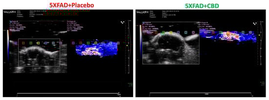 Photoacoustic imaging of the brain demonstrated that inhalant CBD improved the cerebral blood flow significantly in 5xFAD mice compared to the placebo-treated group (Figure 2). The visual overview of blood flow was obtained by color doppler and was based on the color intensity.