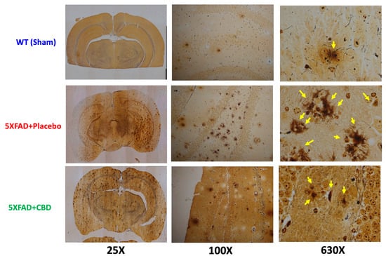 The Bielschowsky silver stain demonstrated that treatment with inhaled CBD reduced the occurrence of neurofibrillary tangles and senile plaques (amyloid plaques) compared to placebo-treated 5xFAD mice (Figure 4). Senile plaques are extracellular deposits of the amyloid beta (Aβ) protein, and their reduction in CBD-treated subjects was consistent with improvements in cognitive function.