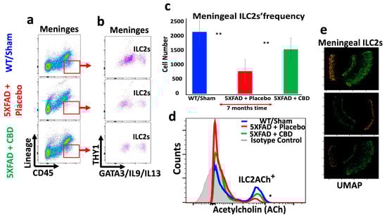 Inhaled CBD shifts immune profile in meninges of mice with AD towards the normal status. (a,b) Flow cytometry analysis showed depletion of meningeal ILC2s in 5xFAD mice with AD compared to the WT mice. Inhaled CBD reversed such alteration towards the normal status. (c) Quantification of meningeal ILC2s frequencies with significant differences between CBD-treated mice versus the placebo group (** p ≤ 0.02) as well as between normal WT and AD mice treated with placebo (** p ≤ 0.01). (d) Histograms from flow cytometric analysis revealed that CBD inhalation enhanced ACh expression by meningeal ILC2s significantly compared to the placebo treated group (* p ≤ 0.05). (e) UMAP analytical pattern demonstrated changes in the distribution and frequency of meningeal ILC2s in WT and 5xFAD mice treated with placebo/CBD.