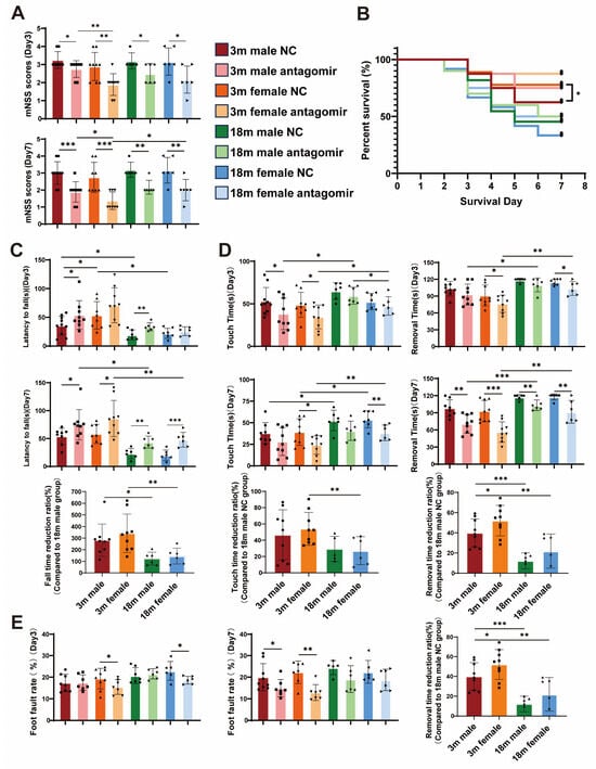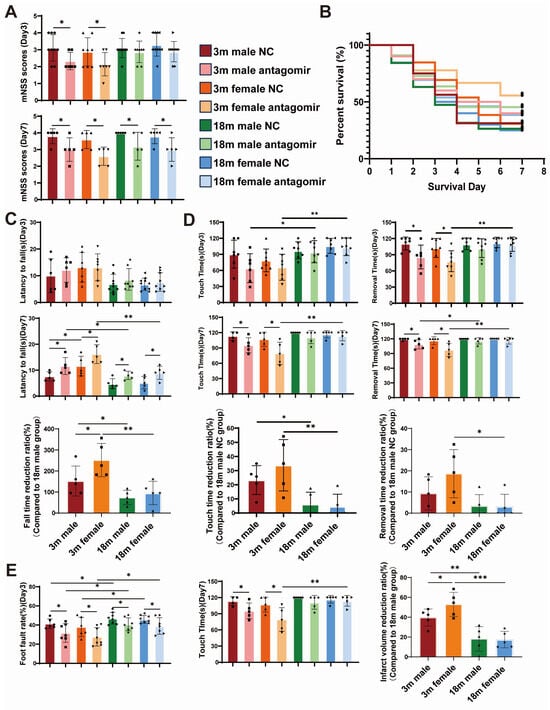 We investigated the effects of miR-15a/16-1 antagomir on functional recovery following transient middle cerebral artery occlusion (tMCAO) in mice. In our study, a 2 × 2 × 2 factorial design was used to examine the effects of three factors—sex (male, female), age (young, aged) and treatment (miR-15a/16-1 NC, miR-15a/16-1 antagomir) on the experimental results. The treatment was administered through the tail vein 2 h post-stroke. Survival rate and neurological deficit were monitored, and sensorimotor behavior was assessed (Figure 2A,B). Statistical analysis indicated that the modified neurological severity score (mNSS) of mice was significantly reduced after injection of miR-15a/16-1 antagomir, and there was a significant difference in the survival rate of mice in the young female treatment group compared to the NC group. Furthermore, sensorimotor behavior tests showed marked improvement in each treatment group compared to each control (Figure 2C–E). Mice treated with the antagomir demonstrated better coordination and balance, indicating enhanced functional recovery. Additionally, the survival rate in the aged NC group was lower compared to the young NC group, with higher mNSS and poorer sensorimotor behavior. Among the young mice, females exhibited significantly better outcomes post-treatment, suggesting a sex-specific enhancement in neuroprotection and functional recovery.