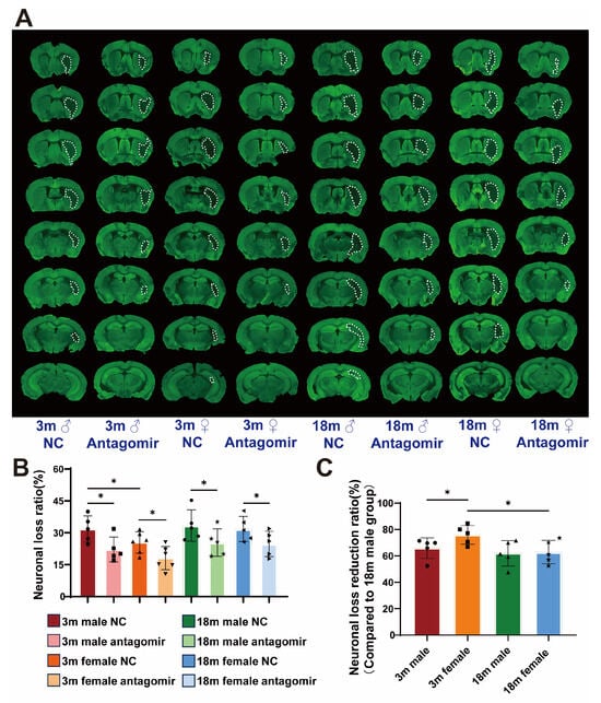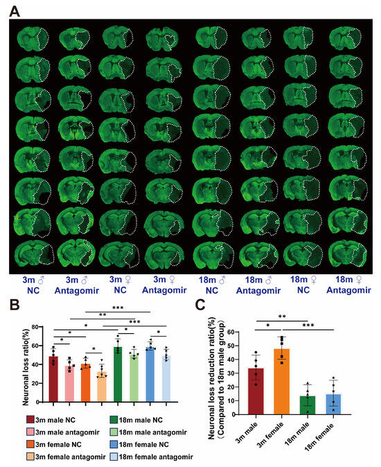 Since, neuronal loss volume is the most straightforward indicator for assessing the severity of cerebral ischemia, we performed MAP2 immunostaining (Figure 4A). The results (Figure 4B,C), consistent with our previous findings, show that NC groups exhibit significant neuronal loss across all age and sex categories. In contrast, mice treated with miR-15a/16-1 antagomir display markedly reduced neuronal loss volumes. Young male and young female mice show significantly lower neuronal loss following antagomir treatment, with young females demonstrating the most substantial reduction. Aged male and female mice also exhibit reduced neuronal loss, but the effect is less pronounced compared to younger mice. These results indicate that miR-15a/16-1 antagomir treatment effectively reduces neuronal loss volume in ischemic stroke, particularly in young mice, with females showing the greatest improvement.