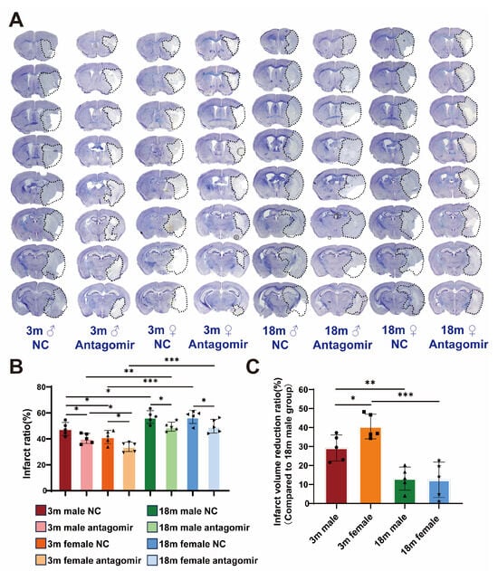 The results of CV staining (Figure 6A) demonstrate that miR-15a/16-1 antagomir significantly reduces brain infarct volume in mice 7 days after pMCAO. As shown in Figure 6B,C, the infarct ratio (%) is substantially lower in the treatment groups compared to the NC groups across young and aged, male and female mice. Notably, young female mice treated with the antagomir exhibit the greatest reduction in infarct volume, followed by young male mice. Differences in therapeutic efficacy between aged mice of different sexes do not appear to be significant. Further analysis reveals a significant reduction in infarct volume, with young females showing approximately three times the reduction compared to the reference group of aged males. These findings indicate that miR-15a/16-1 antagomir treatment effectively mitigates ischemic brain injury, with the most pronounced neuroprotection observed in young female mice.