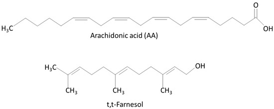 The chemical structures of arachidonic acid (AA) and trans, trans-farnesol (t,t-farnesol).