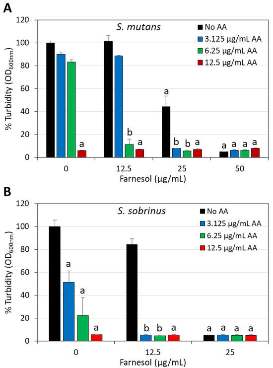 Increased anti-bacterial effect of arachidonic acid and t,t-farnesol against S. mutans (A) and S. sobrinus (B) when combined together. The graphs present the percentage turbidity of planktonic growing bacteria after a 24 h incubation with different concentrations of AA and farnesol. N = 3. a: p < 0.05 when compared to control bacteria. b: p < 0.05 when compared to single treatments.