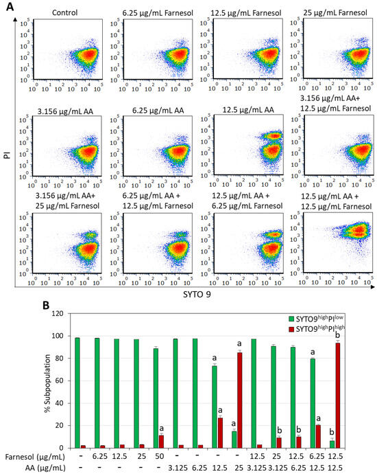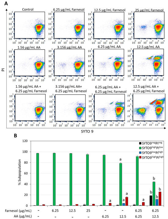 The short-term effect of the combined AA/t,t-farnesol treatment on bacterial viability was determined by exposing the bacteria to different concentrations of these compounds for 2 h, followed by SYTO 9/propidium iodide (PI) live/dead staining and analysis of the fluorescence intensities by flow cytometry. This assay enables the determination of the percentages of dead bacteria within a bacterial population, which is represented by the PI+ bacteria and SYTO 9/PI double negative cells (Figure 3 and Figure 4). SYTO 9 is a neutral molecule that can penetrate both live and dead bacteria and emits green fluorescence when bound to nucleic acids, while PI is positively charged, can only penetrate bacteria with perforated membranes and emits red fluorescence when bound to nucleic acids [48]. Within the 2 h timeframe, t,t-farnesol caused only a small increase in PI staining of S. mutans even at the high MIC of 50 µg/mL (11.2 ± 1.7% PI+ cells versus 1.9 ± 0.25% for control; Figure 3). Also, low percentages of PI+ cells were observed in S. sobrinus when treated with its MIC (25 µg/mL) of t,t-farnesol for 2 h (3.2 ± 0.2% PI+ cells versus 2.3 ± 0.2% for control; Figure 4). AA induced a dose-dependent increase in PI+ cells in S. mutans (26.8 ± 2.1% and 85.1 ± 1.9% at 12.5 and 25 µg/mL AA, respectively; Figure 3). Similarly, 12.5 µg/mL AA caused the appearance of 20.0 ± 1.7% PI+ cells in S. sobrinus after a 2 h incubation (Figure 4). The percentage of PI+ cells increased to 93.7 ± 2.3% when S. mutans was treated with 12.5 µg/mL AA and 12.5 µg/mL t,t-farnesol (Figure 3) and 37.3 ± 2.1% when S. sobrinus was treated with 12.5 µg/mL AA and 6.25 µg/mL t,t-farnesol (Figure 4). Interestingly, a third population was observed in S. sobrinus with the latter AA/t,t-farnesol concentrations, which appeared negative for both SYTO 9 and PI (18.5 ± 1.0%; Figure 4). The SYTO 9negPIneg population, which co-localized with unstained bacteria, likely represents dead bacteria lacking nucleic acid. This population and the PI+-positive population constitute 55.9 ± 3.1% of the entire bacterial culture and represent different stages of dead bacteria (Figure 4). There is also a subpopulation that is still PI+ but with lower SYTO 9 fluorescence intensity (SYTO 9lowPIhigh), which may represent dead bacteria with initial cytoplasmic leakage of SYTO 9. Altogether, these data show that AA causes membrane perforation which is aggravated when the bacteria are co-treated with t,t-farnesol.