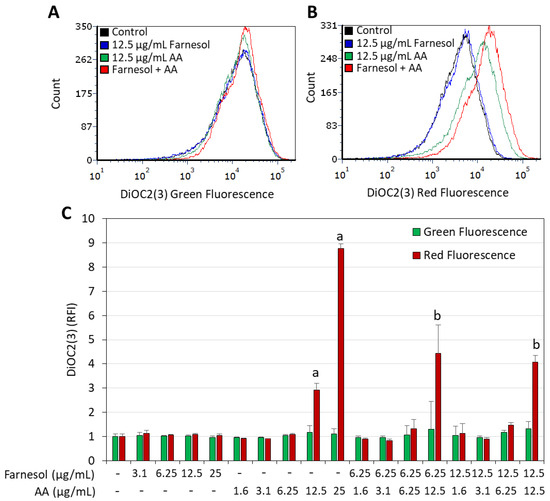 Membrane hyperpolarization induced by arachidonic acid (AA) is intensified when S. sobrinus is co-treated with t,t-farnesol. (A,B). Histograms of DiOC2(3) green fluorescence (A) and red fluorescence (B) of bacteria exposed to 12.5 µg/mL t,t-Farnesol and/or 12.5 µg/mL AA for 15 min. (C). Summary of the relative DiOC2(3) green and red fluorescence intensities of S. sobrinus exposed to the indicated concentrations of the two compounds. RFI = Relative fluorescence intensities calculated according to the geometric mean on the De Novo FCS Express 7.12.0007 software. DiOC2(3) is a potentiometric drug whose red fluorescence is intensified upon membrane hyperpolarization, while the green fluorescence intensity is unaffected by the ΔΨ [50,51]. Thus, an increase in the red fluorescence relative to the green fluorescence is an indication of membrane hyperpolarization. N = 3. a: p < 0.05 when compared to control bacteria. b: p < 0.05 when compared to single treatments.