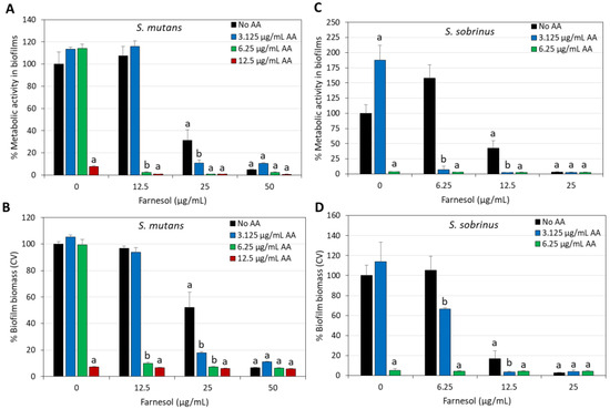 Increased anti-biofilm effects against S. mutans (A,B) and S. sobrinus (C,D) when arachidonic acid (AA) is combined with t,t-farnesol. (A,C) The metabolic activity of the biofilms after a 24 h incubation with different concentrations of AA and t,t-farnesol, as measured by the MTT assay. (B,D) The biofilm biomass after a 24 h incubation with different concentrations of AA and t,t-farnesol, as measured by crystal violet (CV) staining. N = 3. a: p < 0.05 when compared to control bacteria. b: p < 0.05 when compared to single treatments.