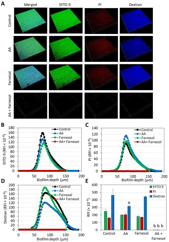 Spinning disk confocal microscopy (SDCM) of S. mutans biofilms formed in the absence or presence of 3.125 µg/mL AA and 12.5 µg/mL t,t-farnesol for 24 h. (A). The individual and merged fluorescence images of the three stains: SYTO 9 that enters both live and dead bacteria and emits green fluorescence; PI that can only enter bacteria with damaged membrane and emits red fluorescence; and AlexaFluor647 Dextran 10,000 that shows the EPS, emits far-red fluorescence and is presented here in blue. The images cover an area of 1497.6 µm × 1497.6 µm. (B–D) The relative fluorescence intensities (RFI) of SYTO 9 (B), PI (C) and Dextran 10,000 (D) in each of the biofilm layers. The numbers on the Y-axis represent the RFI values calculated by NIS element × 10−8. (E) The area under the curve (AUC) of the graphs in B-D. Here the total RFI values were multiplied by 10−9. N = 3–4. a: p < 0.05 when compared to control bacteria. b: p < 0.05 when compared to single treatments.