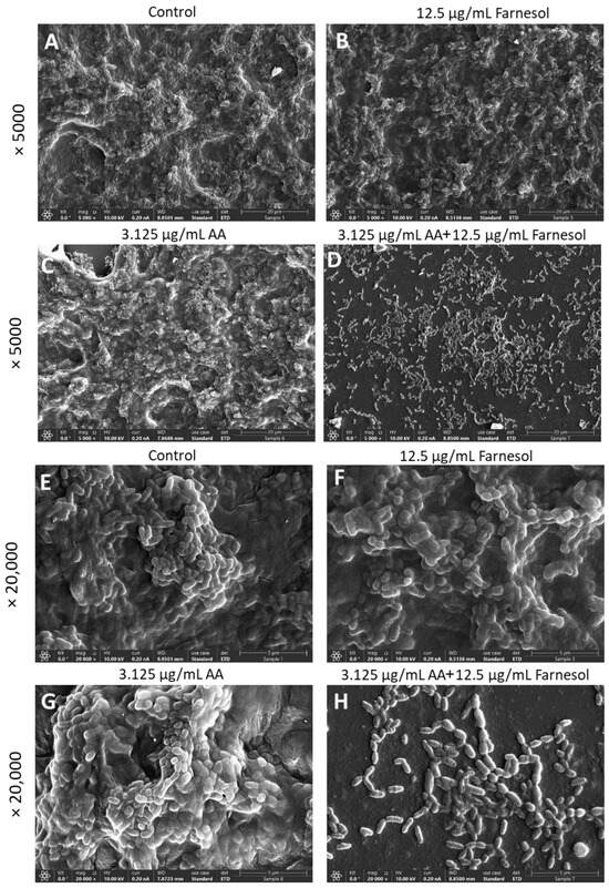 HR-SEM images of S. mutans biofilms formed in the absence or presence of 3.125 µg/mL AA and 12.5 µg/mL t,t-farnesol for 24 h. (A–D) ×5000 magnifications. The bar represents 20 µm. (E–H) ×20,000 magnifications. The bar represents 5 µm.