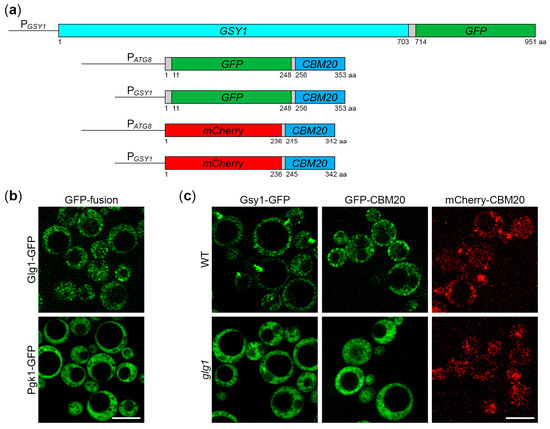 To verify our findings with Gsy1-GFP, we used the CBM20 (carbohydrate-binding module, family 20) domain of the human STBD1 (starch binding domain 1) protein. Mammalian STBD1 acts as the autophagic receptor of GGs, tagging them for autophagic degradation via its C-terminal CBM20 domain that binds glycogen [14,15]. Recently, the CBM20 domain of human STBD1 was successfully used to detect GGs as a part of GYSC, the glycogen-binding probe containing the glutathione S-transferase, myc-tag, and CBM20 domain [23]. However, GYSC had to be expressed in bacteria, purified, and used in combination with primary and secondary antibodies to detect GGs in mammalian cells and tissues. This limited its use to ELISA and immunofluorescence microscopy [23]. To overcome these limitations, we created genetically encoded CBM20-based markers of GGs suitable for live microscopy and immunoblotting: GFP-CBM20 and mCherry-CBM20 (Figure 1a). For flexibility in expression levels, both fusions were placed separately under a weaker ATG8 promoter and a stronger GSY1 promoter. In summary, we created four integrative plasmids, pRK29, pRK34, pRK28, and pRK32, with PATG8-GFP-CBM20, PGSY1-GFP-CBM20, PATG8-mCherry-CBM20, and PGSY1-mCherry-CBM20 expression cassettes, respectively (Figure 1a).