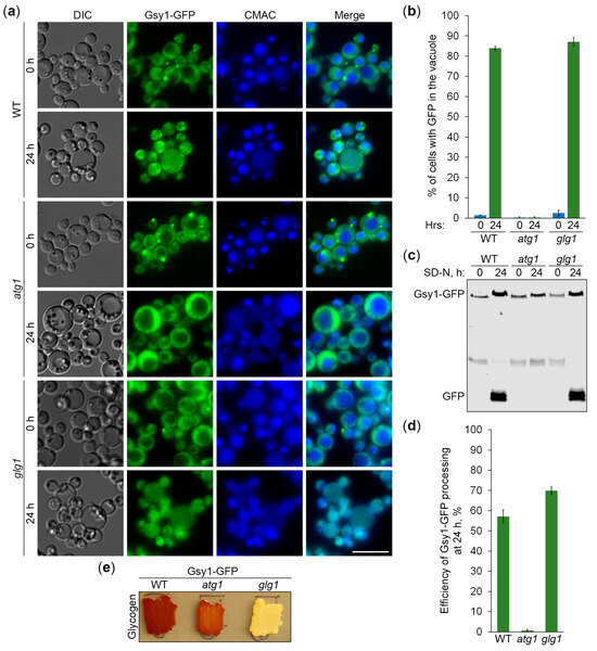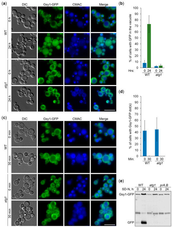 Previously, we showed that K. phaffii GGs are degraded by non-selective (bulk) autophagy in the first 24 h of nitrogen starvation [18]. Since Gsy1-GFP marks GGs, its delivery to the vacuole is expected to be dependent on autophagic machinery. To test this, we compared the vacuolar delivery of Gsy1-GFP in WT and atg1 (autophagy related 1 [21]) cells by epifluorescence microscopy (Figure 2a), as we did before for Glg1-GFP [18]. Due to the lower resolution of epifluorescence microscopy compared to confocal microscopy, the granular pattern of Glg1-GFP by confocal microscopy (Figure 1b) presented itself as a diffuse cytosolic pattern by epifluorescence microscopy [18] after 0 h of nitrogen starvation. Similarly, Gsy1-GFP appeared mostly as diffuse cytosolic in WT and atg1 strains at 0 h of nitrogen starvation (Figure 2a). However, in contrast to Glg1-GFP [18], Gsy1-GFP also localized to the dot-like structure in both strains. This dot-like structure disappeared after 24 h of nitrogen starvation in both WT and atg1 cells, suggesting a non-autophagic mechanism of its removal. Importantly, the bulk of Gsy1-GFP was redistributed from the cytosol to the CMAC-stained vacuole in WT, but not atg1, cells at the 24 h time-point (Figure 2a,b), proving the autophagic delivery of Gsy1-GFP to the vacuole, as expected.