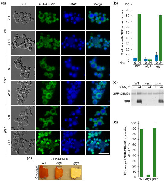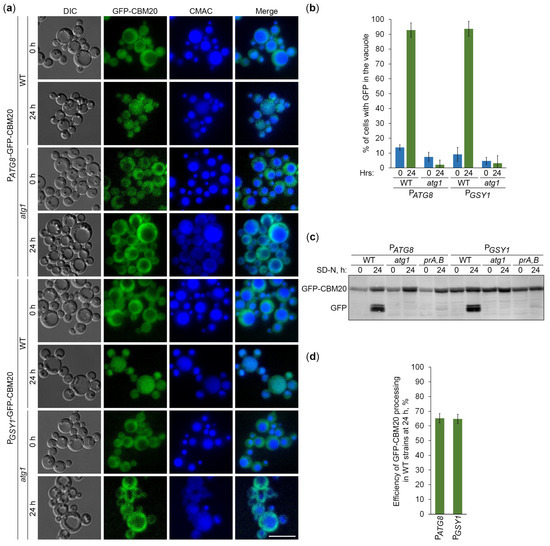 GFP-CBM20 reports about glycogen autophagy. (a) Delivery of GFP-CBM20 to the vacuole. WT and atg1 cells expressing GFP-CBM20 from the corresponding promoter were grown in YPD for 1 day. A portion of the cells was transferred to SD-N for 24 h. Remaining YPD cultures were stained with CMAC for 30 min and imaged as “0 h”. The last 30 min of SD-N cultures was incubation with CMAC before imaging them as “24 h”. Scale bar, 10 µm. (b) Quantification of images in (a). Displayed are averages and standard deviations. (c) Processing of GFP-CBM20 in the vacuole. WT, atg1, and prA,B cells with GFP-CBM20 under corresponding promoters were grown in YPD for 1 day. A portion of the cells was transferred to SD-N. At 0 and 24 h, equal volumes of cultures (not equal biomass) were taken from SD-N for immunoblotting. (d) Quantification of immunoblotting in (c). Displayed are averages and standard deviations.
