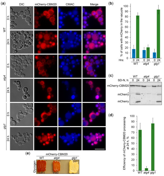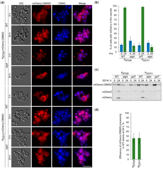 Since CBM20 fusions mark GGs, their delivery to the vacuole is expected to be dependent on the core autophagic machinery. To verify this, we followed the vacuolar delivery of differentially expressed GFP-CBM20 in WT and atg1 cells (Figure 4a) and differentially expressed mCherry-CBM20 in WT and atg4 (autophagy related 4 [24]) cells (Figure 5a) by epifluorescence microscopy. Due to the lower resolution of epifluorescence microscopy compared to confocal microscopy, the granular localization of CBM20 fusions by confocal microscopy (WT in Figure 1c) appeared as diffuse cytosolic by epifluorescence microscopy in all the strains after 0 h of nitrogen starvation (Figure 4a or Figure 5a). Importantly, the bulk of CBM20 fusions was redistributed from the cytosol to the CMAC-stained vacuole in the WT strain, but not in atg1 (Figure 4a) and atg4 (Figure 5a) mutants after 24 h of nitrogen starvation. Interestingly, the percentage of WT cells with either GFP (Figure 4b) or mCherry (Figure 5b) signals in the vacuole was nearly identical for CBM20 fusions expressed from the ATG8 and GSY1 promoters. Together, these microscopy experiments proved the autophagic delivery of CBM20 fusions to the vacuole, as expected.