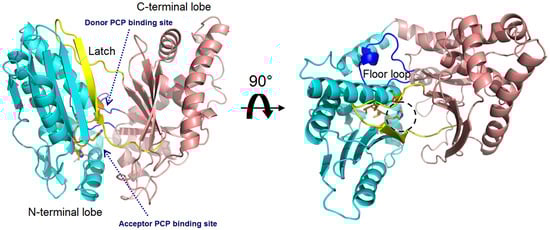 The structural study of the C domain has been extensively conducted. The first crystal structure reported for the C domain is VibH belonging to the vibriobactin synthetase system from Vibrio cholerae [14]. Dissimilar to most C domains, VibH is a standalone domain. Structures of the cores of the C domain are mostly conserved, providing a foundation for the study of homologous C domains catalyzing similar reactions. The C domain typically consists of approximately 450 amino acids and adopts a pseudo-dimeric chloramphenicol acetyltransferase (CAT) fold, composed of two subdomains at the N- and C-termini. Each subdomain consists of a small peripheral β-strand flanked by five α-helices. The two subdomains are connected by α-helices and interact more closely on one side, resulting in the overall V-shaped structure (Figure 3). In the C-terminal subdomain, a loop, known as the “latch”, extends to the N-terminal subdomain, followed by one or two loops at the end of the N-terminal β-strands (Figure 3). In addition to the gatekeeper, there is a second smaller crossover region called the “floor loop” [15,16], which stretches from the C-terminal subdomain to link with an α-helix at the N-terminal subdomain. Between the interfaces of the two subdomains, a cleft is formed. The donor and acceptor Ppant arms, tethered on the PCP domains, must cross this cleft from opposite sides to approach the conserved active site motif HHxxxDG, which is located in a loop connecting the central β-strand and a long α-helix of the N-terminal subdomain [17] (Figure 3).