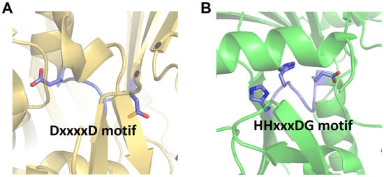 Glycopeptide antibiotics (GPAs) are a class of cell wall biosynthesis inhibitors with a unique mechanism of action involving the binding of substrates involved in cell wall biosynthesis, thereby inhibiting the growth of Gram-positive bacteria [45]. Oxidative cross-linking of aromatic side chains catalyzed by cytochrome P450 monooxygenase is required for GPAs to achieve their final active conformation [46]. The X domain is a unique recruitment domain involved in the biosynthesis of GPA. This domain is responsible for recruiting multiple cytochrome P450 monooxygenases to the NRPS-bound peptide, facilitating the necessary side chain cross-linking for peptide oxidation or cyclization [46,47,48]. The X domain adopts a C/E-type folding, characterized by a V-shaped arrangement of its two subdomains, both of which belong to the CAT fold with the region corresponding to canonical C-domain active site features the HRxxxDD motif, which is located in the N-terminal subdomain (Figure 5) [46].