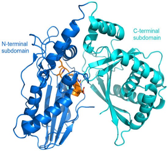 Overall structure of the X domain of Tcp12, the terminal module for biosynthesizing teicoplanin from Actinoplanesteichomyceticus (PDB code: 4TX2). The two subdomains are represented in different colors, and the side chains in the HRxxxDG motif (corresponding to the canonical C-domain active site) located in the N-terminal subdomain are represented as orange sticks.