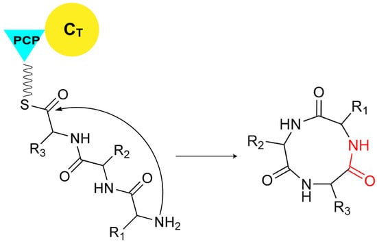 The CT domain releases the final product through macrocyclization by employing the terminal amine as a nucleophilic agent.