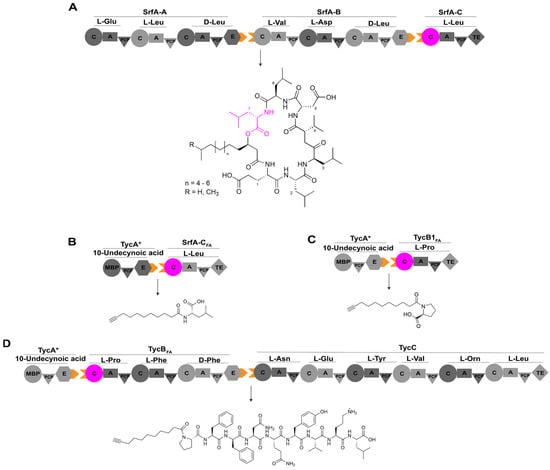 - Hahn, M.; Stachelhaus, T. Selective interaction between nonribosomal peptide syntheltases is facilitated by short commuinication-mediating domains. Proc. Natl. Acad. Sci. USA 2004, 101, 15585–15590. [Google Scholar] [CrossRef]