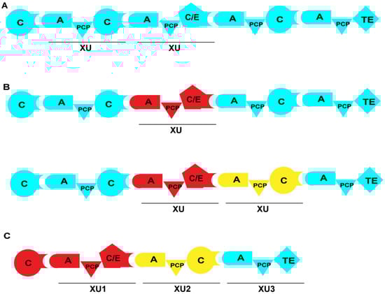 Strategy of NRPS engineering involving XU. (A) Typical XUs within the NRPS module. (B) Recombinant NRPS with the replacement of one or multiple XUs. (C) De novo construction of NRPS by using XUs. XUs from different NRPSs are represented in various colors.
