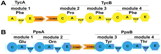 A number of approved pharmaceuticals are sourced from natural products or their derivatives [1]. Among these bioactive compounds, nonribosomal peptides (NRPs) represent a highly diverse category in terms of both functions and structures. NRPs exhibit a wide range of biological activities and can act as antibiotics, immunosuppressants, anticancer agents, metal carriers, pigments, and many other types of functional substances [2]. Diverse structures, including linear, cyclic, or branched forms, have been found in NRPs, which can be further modified to yield different chemical structures with multiple physicochemical properties [3] (Figure 1). NRPs are synthesized by large multi-modular megaenzymes referred to as nonribosomal peptide synthetases (NRPSs) [4]. NRPSs are among the largest and most complicated enzymes in nature, with their immense size due to their architecture, which is an assembly line consisting of a series of repeating catalytic units, referred to as modules, that are responsible for the incorporation of certain amino acids, or other types of acyl monomers in either a collinear or nonlinear mode [5,6]. In general, the number and arrangement order of modules corresponding to different monomer substrates directly correspond to the number and sequence of the peptide product [7]. In addition to the initiation module, each module typically contains at least three essential core domains: the condensation (C) domain, the adenylation (A) domain, and the peptidyl carrier protein (PCP) domain (Figure 2A).