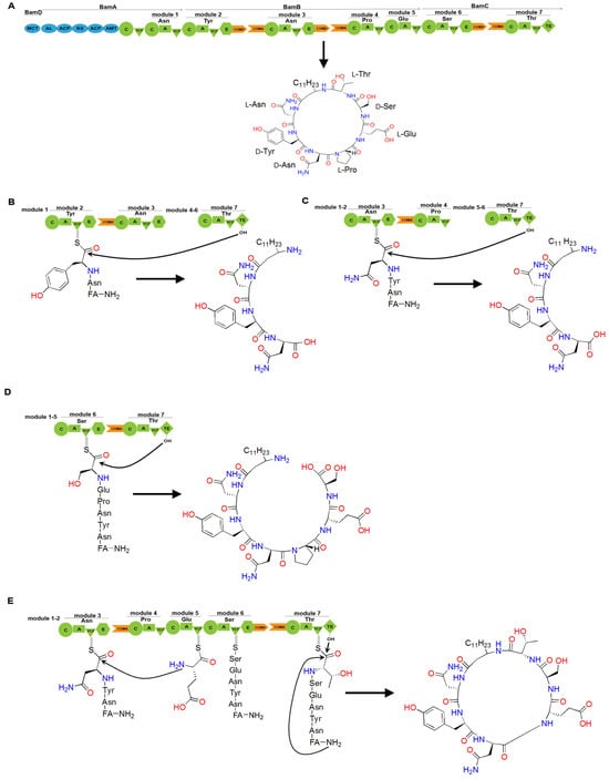 The assembly line of bacillomycin D and its engineering. (A) The cyclic lipopeptide structure of bacillomycin D is composed of a β-amino fatty acid chain linked to a heptapeptide. Bacillomycin D synthase is a PKS/NRPS hybrid enzyme comprising four units: BamD, BamA, BamB, and BamC. The blue regions in bamD and bamA represent PKS domains. (B) Deletion of the COMD domain in module 2 results in premature hydrolysis by the TE domain, generating a linear dipeptide linked to a β-amino fatty acid chain. (C) Deletion of the COMD domain in module 3 leads to premature hydrolysis by the TE domain, generating a linear tripeptide linked to a β-amino fatty acid chain. (D) Deletion of the COMD domain in module 6 leads to premature hydrolysis by the TE domain, generating a linear hexapeptide linked to the β-amino fatty acid chain. (E) Deletion of the COMD domain in module 3 leads to the skipping of module 4, generating a cyclic hexapeptide linked to a β-amino fatty acid chain. Abbreviations: FA stands for fatty acid.
