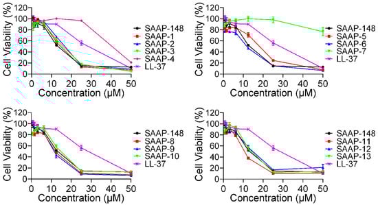 2.4. Cytotoxicity Activity of SAAP-148 and Its Analogues