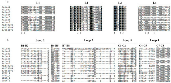 Multiple sequence alignment and structural domain analysis of A. auricula-judea laccases AaLac1 to AaLac7: (a) The laccase signature sequences L1–L4. The histidine and cysteine residues are indicated according to the type of copper, with 1, 2, and 3 above representing type-1, type-2, and type-3, respectively. The amino acid sequences of A. polytricha laccases and A. subglabra laccase downloaded from NCBI are named by the GeneBank accession number. The shade levels represent conservation degrees. (b) To confirm the sequence of the potential substrate binding loop of the A. auricula-judae laccases enzyme, it was identified based on structural alignment with loops 1–4 of Melanocarpus albomyces (PDB code 1GW0), Trametes versicolor laccase I (PDB code 1GYC), T. versicolor laccase III (PDB code 1KYA), Lentinus tigrinus (PDB code 2QT6).