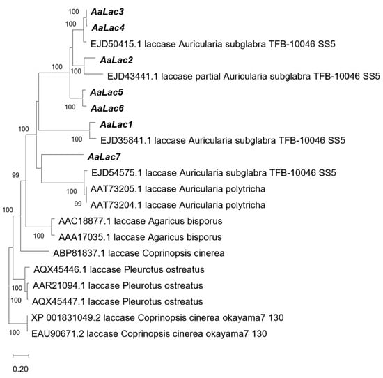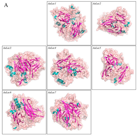 Genes belonging to the laccase family are known to contain Cu-Oxidase, Cu-Oxidase_2, and Cu-Oxidase_3 (PF00394, PF07731, PF07732) domains. Hidden Markov model (HMM) profiles were downloaded from InterPro (https://www.ebi.ac.uk/interpro/download/Pfam/, accessed on 16 January 2024), and CDS generated through RNA sequencing were searched using HAMMER software version 1.3 [68] with an expected value (E-value) < 1 × 10−5. As a result, 19 putative laccase genes with all three domains were discovered. To reduce redundancy, sequences with over 90% identity were removed using Decrease Redundancy (https://web.expasy.org/decrease_redundancy/, accessed on 16 January 2024), resulting in 7 defined protein sequences from the initial 19 putative laccase genes. The 7 genes, each containing all three domains, were classified as members of the Laccase family and named AaLac1 through AaLac7. These 7 laccase genes obtained in this study have been submitted to NCBI’s GenBank (PP337285 to PP337291).