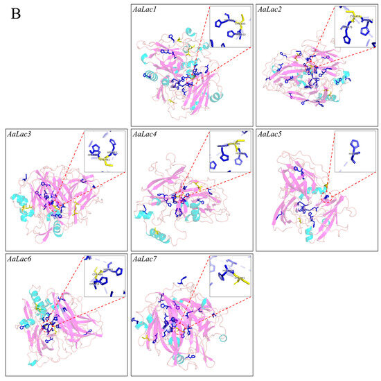 Different laccase sequences within the laccase family contain four conserved signature sequences, including ten histidines and one cysteine at the copper-binding center [49]. AaLac also demonstrated high consistency in the signature sequences. However, some parts of the signature sequences of AaLac4, AaLac5, and AaLac7 were not identified. In AaLac4, a deletion of two histidines was observed, while in AaLac5, deletions of three histidines and one cysteine were identified. Another noteworthy observation is that in the signature sequence L4 of AaLac7, two histidines included in T1 Cu and T3 Cu were replaced by other amino acids. Histidine and cysteine bind to the T1 site, where substrate oxidation occurs, and coordinate its function [50]. These substitutions and deletions affect copper binding and electron transfer functions, which may result in AaLac4, AaLac5, and AaLac7 showing differences in stability and activity compared to other enzymes within the family. Analysis of the SBL sequences of AaLac revealed that, in the B4-B5 region, serine (S) appeared in all sequences except AaLac1, 2, and 7, where glycine (G) and alanine (A) were observed instead. In the B1–B2 region, AaLac3 and AaLac4 share the same sequence, which is also identical in AaLac5 and AaLac6. This pattern is consistent with the phylogenetic tree results. Since the SBL can regulate laccase catalytic efficiency, it is suggested that AaLac3–4 and AaLac5–6 may have similar functions within their respective groups [51].