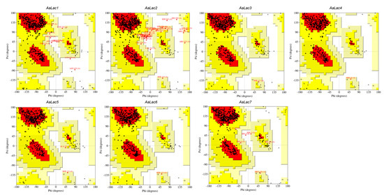 Based on the amino acid sequences of the 7 AaLac proteins, the tertiary structure of the laccase protein was modeled (Figure 3A). As a result, it was observed that beta sheets predominated in the tertiary structure of all laccases, which is consistent with Table 1. The Ramachandran plot is shown in Figure 4. Ramachandran plot analysis of the laccase family showed 80.3–90.2% of amino acid residues within the most favored regions (Table 3). Additionally, ProSA Z-scores ranged from −8.55 to −6.71, and QMEAN scores ranged from 0.56 to 0.77. These protein validation metrics emphasize that the predicted models are both reliable and structurally stable. The positions of histidine and cysteine residues were identified in the tertiary structure of the laccase family, confirming the presence of the Histidine-Cysteine-Histidine (His-Cys-His) motif (Figure 3B). In AaLac5, where a deletion occurred in the signature sequence L4, an intact His-Cys-His motif could not be observed. Similarly, in AaLac7, where a substitution occurred, one histidine residue was also absent. The RMSD values among the laccase family ranged from 0.182 to 4.222 Å (Table 4). Specifically, AaLac4 and AaLac1 showed an RMSD of 4.222 Å, indicating low similarity, while all other structures showed high similarity within the family, with RMSD values under 3 Å. Notably, the RMSD between AaLac3 and AaLac4 was 0.182 Å, indicating high similarity, as was the case for AaLac5 and AaLac6, with an RMSD of 0.228 Å. This result aligns with the trends observed in SBL and phylogenetic analysis.