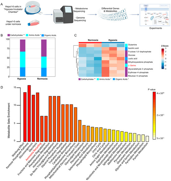 (A) Flowchart design of this study. (B) Composition of three major differential metabolites in Hepa1-6 cells under hypoxic and normoxic conditions: carbohydrates, amino acids, and organic acids. (C) Differentially abundant metabolites (top ten) under hypoxic and normoxic conditions. (D) Differentially abundant metabolite enrichment plot. * p < 0.05, ** p < 0.01.