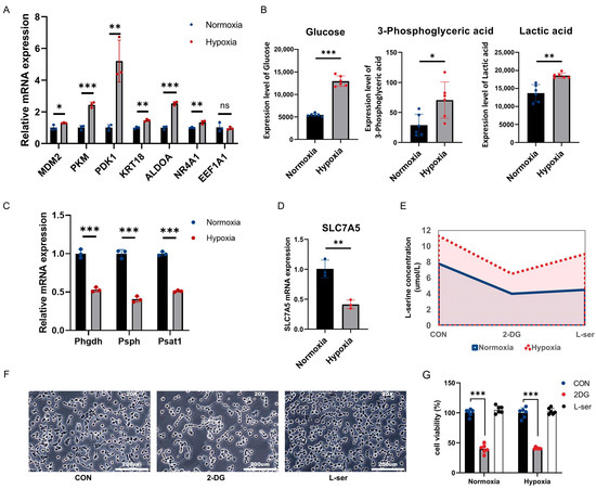 To further clarify the cause of elevated L-serine levels, we first examined the expression of glycolysis-related genes, which showed significantly increased expression in tumor cells under hypoxia. We found that most glycolysis-related genes, except for eukaryotic translation elongation factor 1 alpha 1 (EEF1A1), were significantly upregulated after hypoxia (Figure 3A). Key metabolite analysis further demonstrated increased glycolysis under hypoxia (Figure 3B), which was consistent with previous studies. One of the major sources of L-serine is glycolysis-related synthesis and exogenous uptake, and we hypothesized that the elevation of L-serine levels was due to either elevated glycolysis or increased uptake. We examined key genes involved in L-serine synthesis and detected a significant decrease in the expression of PHGDH, PSPH, and phosphoserine aminotransferase 1 (PSAT1), which was consistent with the GSEA results (Figure 3C). Similarly, expression of the key gene involved in L-serine uptake, solute carrier family 7 member 5 (SLC7A5), was significantly downregulated (Figure 3D). This suggests that elevated L-serine levels are not caused exclusively by L-serine synthesis and uptake. To further support these findings, we used 2-Deoxy-D-glucose (2-DG) to inhibit glycolytic flux and exogenous L-serine restriction to reduce L-serine uptake. Neither treatment completely blocked the increase in the L-serine pool under hypoxia; in particular, there was no significant change in L-serine restriction under hypoxia (Figure 3E). Cell proliferation was observed under these conditions. The results showed that 2-DG significantly inhibited cell proliferation under hypoxia, which was consistent with the results of a large number of studies [26]. However, the change in exogenous L-serine did not affect cell proliferation (Figure 3F). Overall, we conclude that the increase in L-serine under hypoxia is partly caused by elevated glycolysis but has little effect on exogenous L-serine uptake.