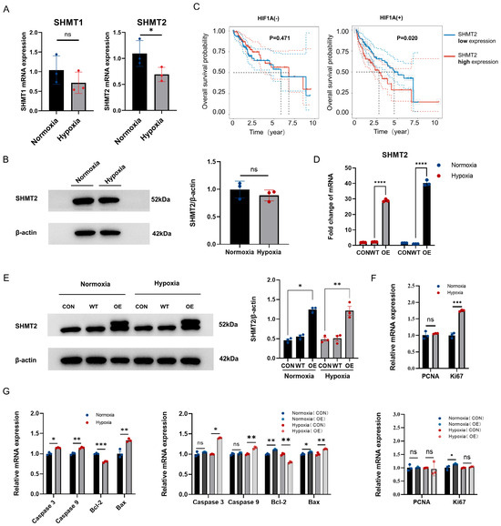 (A) mRNA expression levels of the SHMT1 and SHMT2 genes. (B) Expression level of the SHMT2 protein. (C) Prognostic analysis of high and low SHMT2 expression in HIF1A-positive and negative patients (TCGA data). (D) Evaluation of SHMT2 overexpression efficiency (OE) at the genetic level. (E) Assessment of SHMT2 overexpression efficiency (OE) at the protein level. (F) Expression levels of molecular markers directly associated with cell proliferation processes. (G) Expression levels of core members of the apoptosis pathway family. ns p > 0.05; * p < 0.05, ** p < 0.01, *** p < 0.001, **** p < 0.0001.