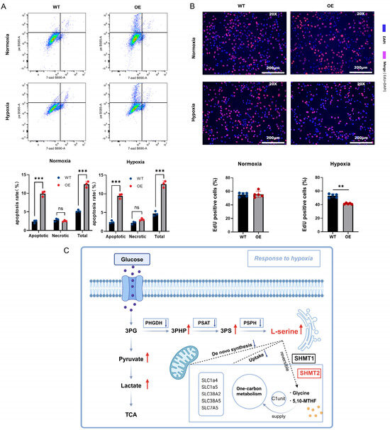 (A) Analysis of apoptosis in Hepa1-6 cells under normoxic and hypoxic conditions using flow cytometry. (B) Detection of cell proliferation in Hepa1-6 cells under normoxic and hypoxic conditions using EdU staining. (C) High L-serine response of Hepa1-6 cells under hypoxia: Hypoxia leads to increased glycolysis, increased 3PHP and 3PS, and elevated L-serine production. A high L-serine pool causes the downregulation of amino acid synthesis genes such as PHGDH, PSAT1, and PSPH, which inhibit the de novo synthesis of L-serine, as well as the downregulation of L-serine uptake genes such as SLC7A5, which inhibits the exogenous uptake of L-serine. Additionally, downregulating SHMT2 inhibits the catabolism of L-serine into glycine and 5,10-MTHF. Together, these factors maintain high levels of L-serine stabilization in response to cellular metabolism under hypoxia. ns p > 0.05; ** p < 0.01, *** p < 0.001.
