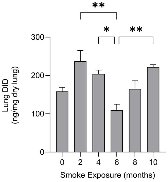 Total lung DID was increased at two months, then markedly decreased over the next four months before undergoing a secondary increase over the remaining course of the study []. N ≥ 3 for each group. T-bars indicate the standard error of the mean (SEM). The number of asterisks above the bars correlates with the level of statistical significance (p < 0.05, p < 0.01).