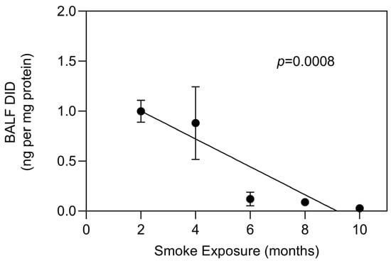 Our laboratory studied the effect of a ten-month exposure to cigarette smoke on mouse lung elastic fibers []. Total lung DID was initially increased at two months, then markedly decreased over the next four months before undergoing a secondary increase over the remaining course of the study, suggesting changes in the balance between elastic fiber injury and repair (Figure 2). This concept is further supported by markedly decreased BALF DID levels at 6 months, consistent with reduced elastin breakdown as the repair of elastic fibers progresses (Figure 3).