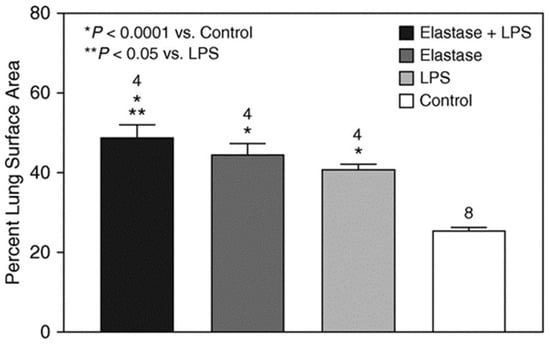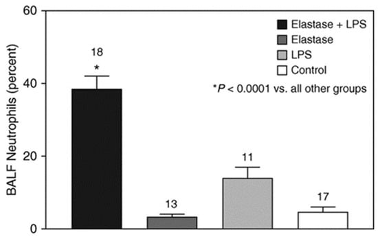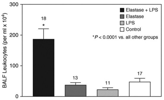 The intratracheal administration of elastase prior to the instillation of LPS results in a significantly higher level of BALF neutrophils compared to the other treatment groups []. The numbers above the bars indicate N. T-bars denote SEM. Reprinted with permission.