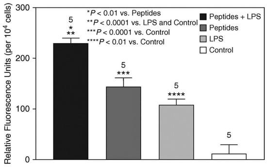 The combination of elastin peptides and LPS had a significantly greater chemoattractive effect on BALF macrophages compared to the other treatment groups []. Chemotattraction was measured by labeling cells with a fluorescent dye. The numbers above the bars indicate N. T-bars denote SEM. Reprinted with permission.