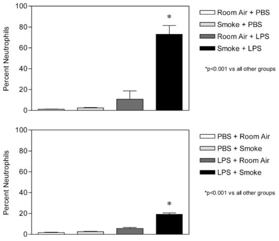 Exposure to cigarette smoke prior to intratracheal instillation of LPS (upper graph) results in a significantly greater influx of neutrophils into the lung compared to post-treatment with smoke (lower graph) []. N = 5 for each group. T-bars indicate SEM. Reprinted with permission.