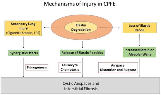 These findings support the concept that elastase has multiple roles in the pathogenesis of CPFE. The degradation of elastic fibers causes the release of elastin peptides, which attract inflammatory cells, bind to elastin receptor complexes, and induce various cellular activities, including elastogenesis, protease activation, and apoptosis []. While these events may not be directly related to the development of interstitial fibrosis, they nevertheless produce changes in the alveolar wall extracellular matrix (ECM) that can induce fibrogenesis [].
