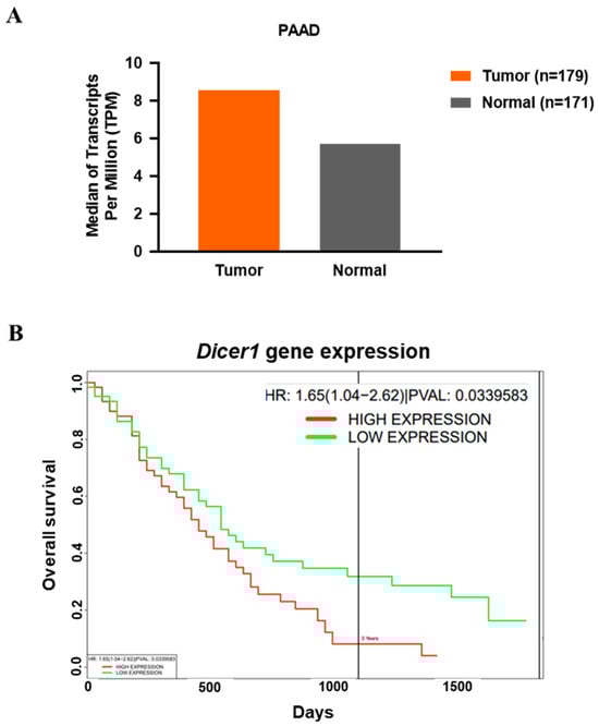 The expression level of Dicer1 in PDAC tumor tissues and its impact on survival rates. (A) Analysis of the difference in Dicer1 gene expression between PDAC tumor tissues (PAAD, n = 179) and normal tissues (n = 171) using the online database GEPIA; (B) survival analysis of pancreatic cancer patients based on Dicer expression levels (red line: high expression; green line: low expression) using the PROGgeneV2 Prognostic Database.